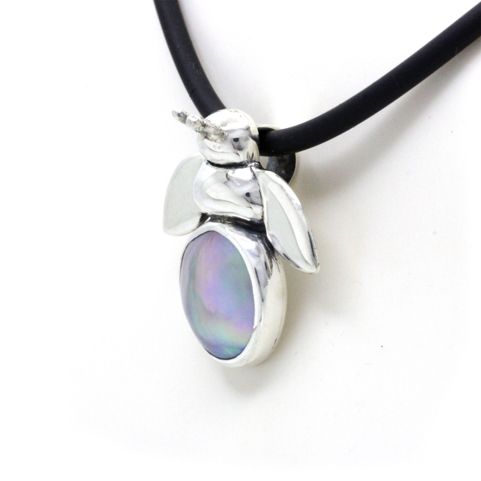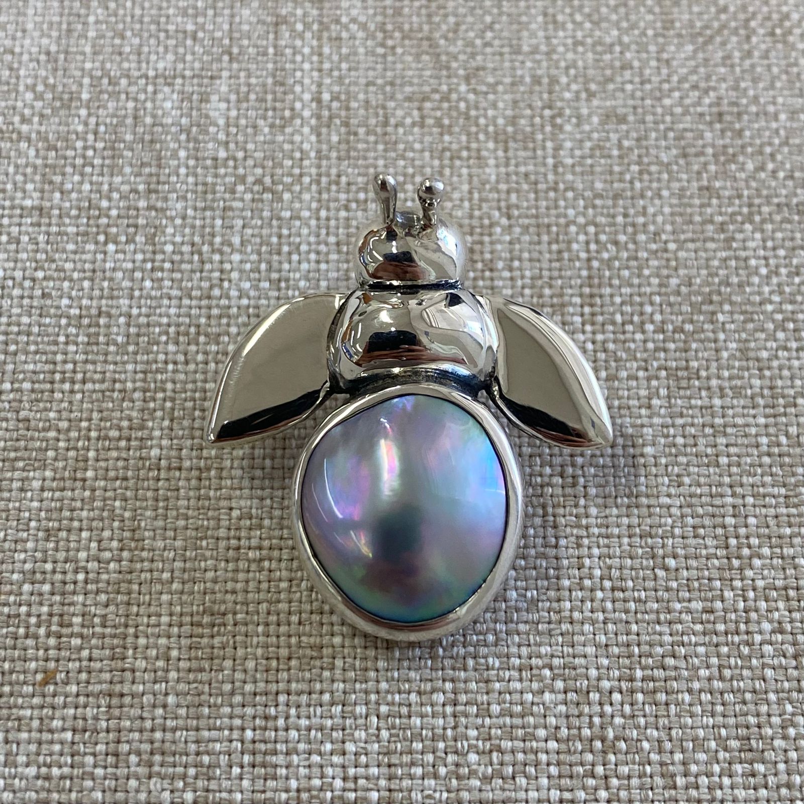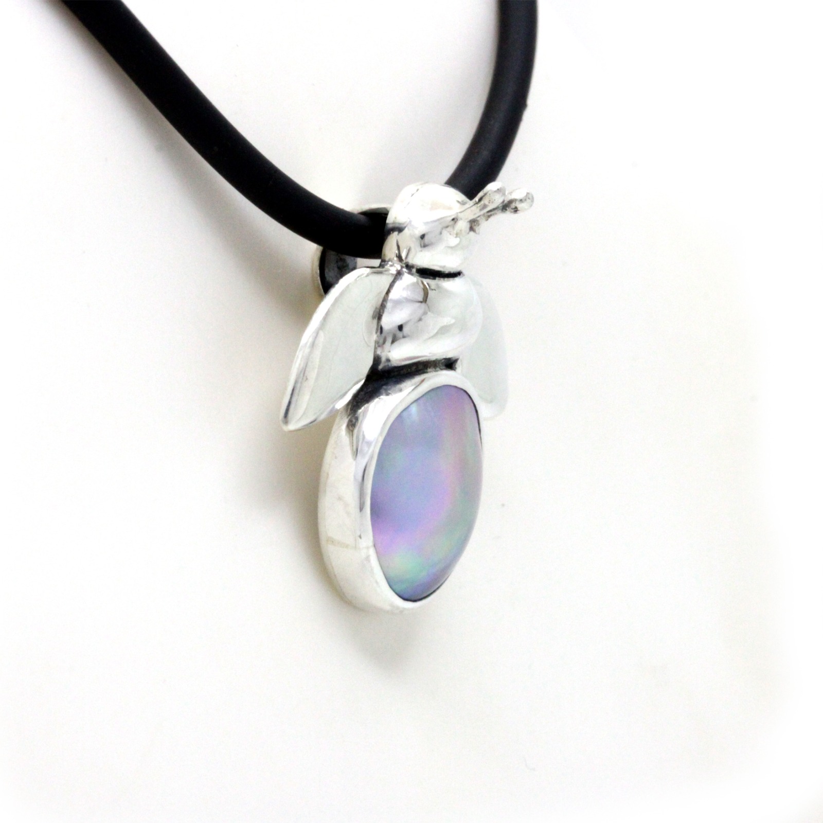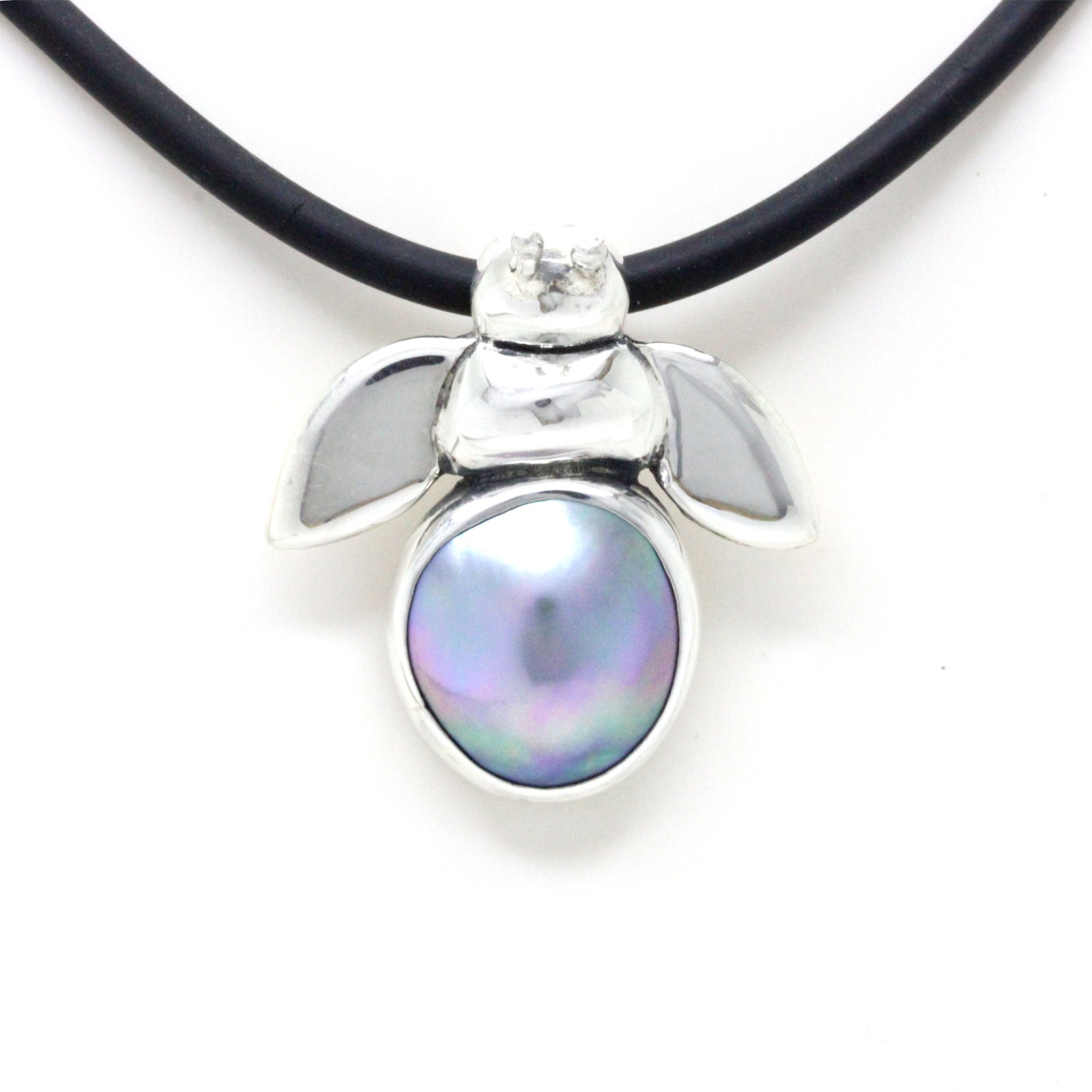 “Bee” is our new pendant design, hand-crafted in fine Mexican Silver (0.975) made by Priscila Canales (Mexican Designer) and has a beautiful Cortez Mabe Pearl. You’ll see a lustrous surface, and iridescent overtones like pink and green mainly. In addition, this unique shape is just perfect for this design.