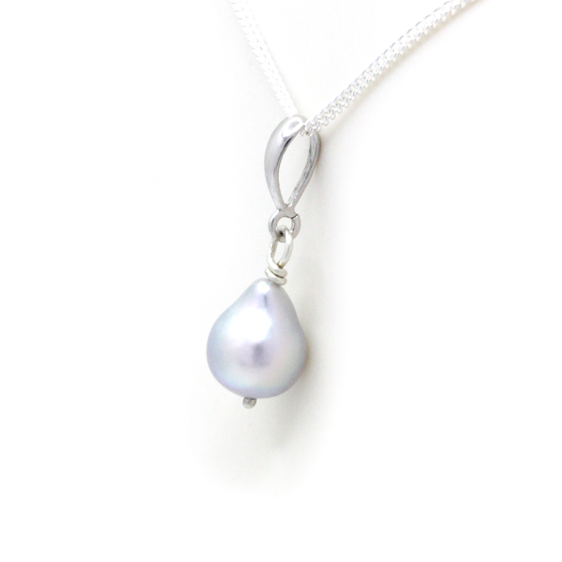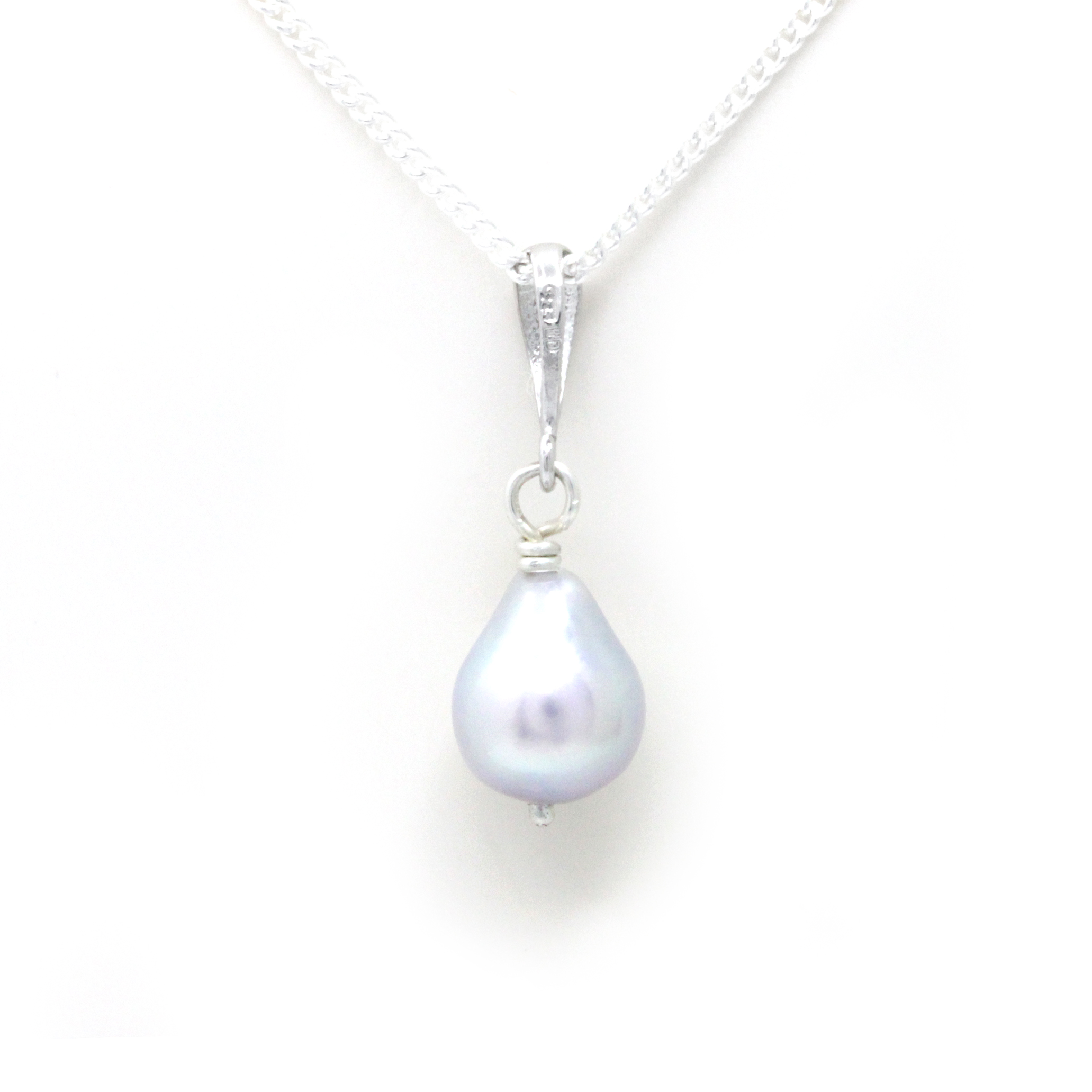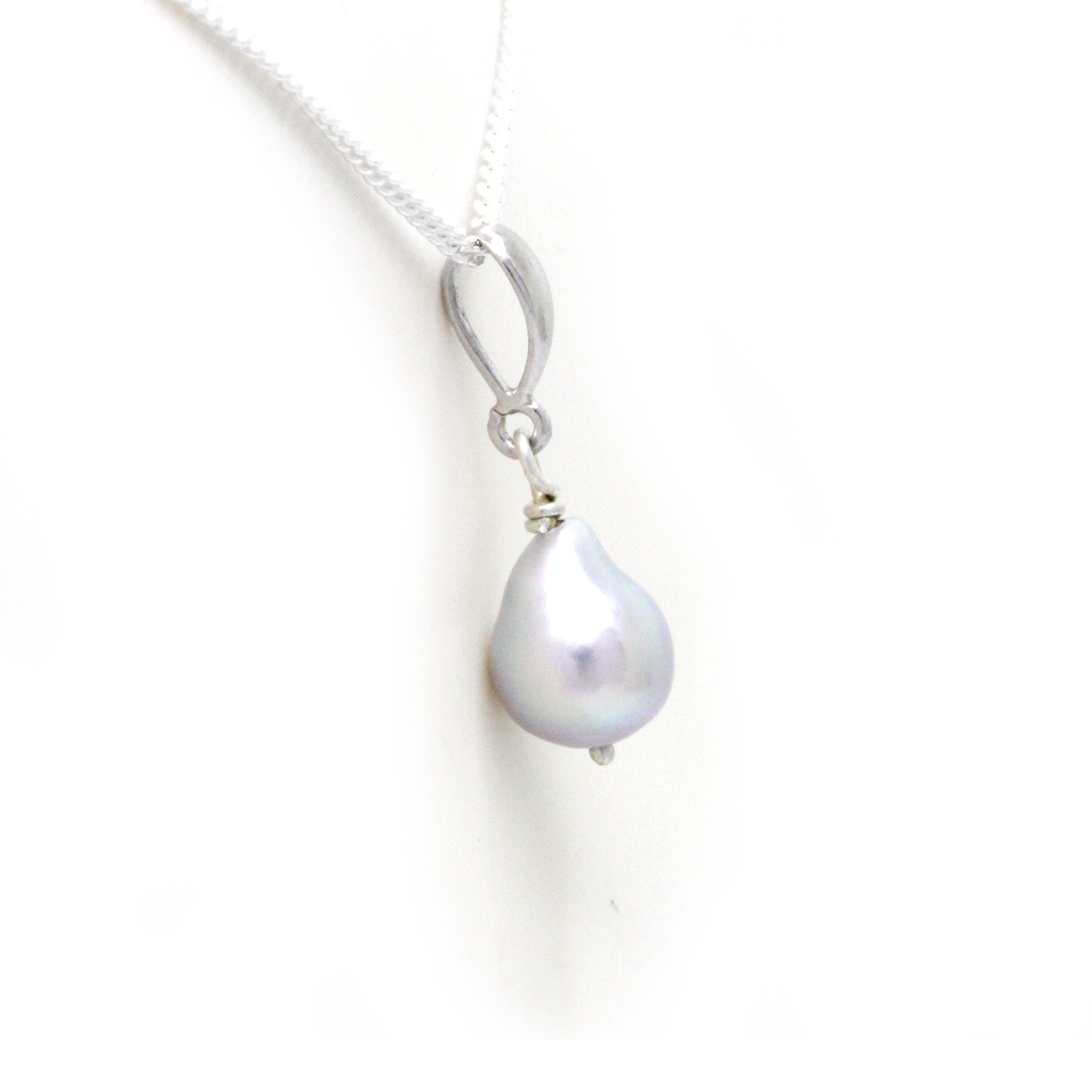 A simple and classic sterling silver (0.925) pendant that features an very unique Cortez Loose Pearl. This pearl has a special drop shape and a very clean and soft surface. The luster that has is very shinny like no other and the colors are lovely. Baby blue and even pinky sparkles. You’ll love it for sure!