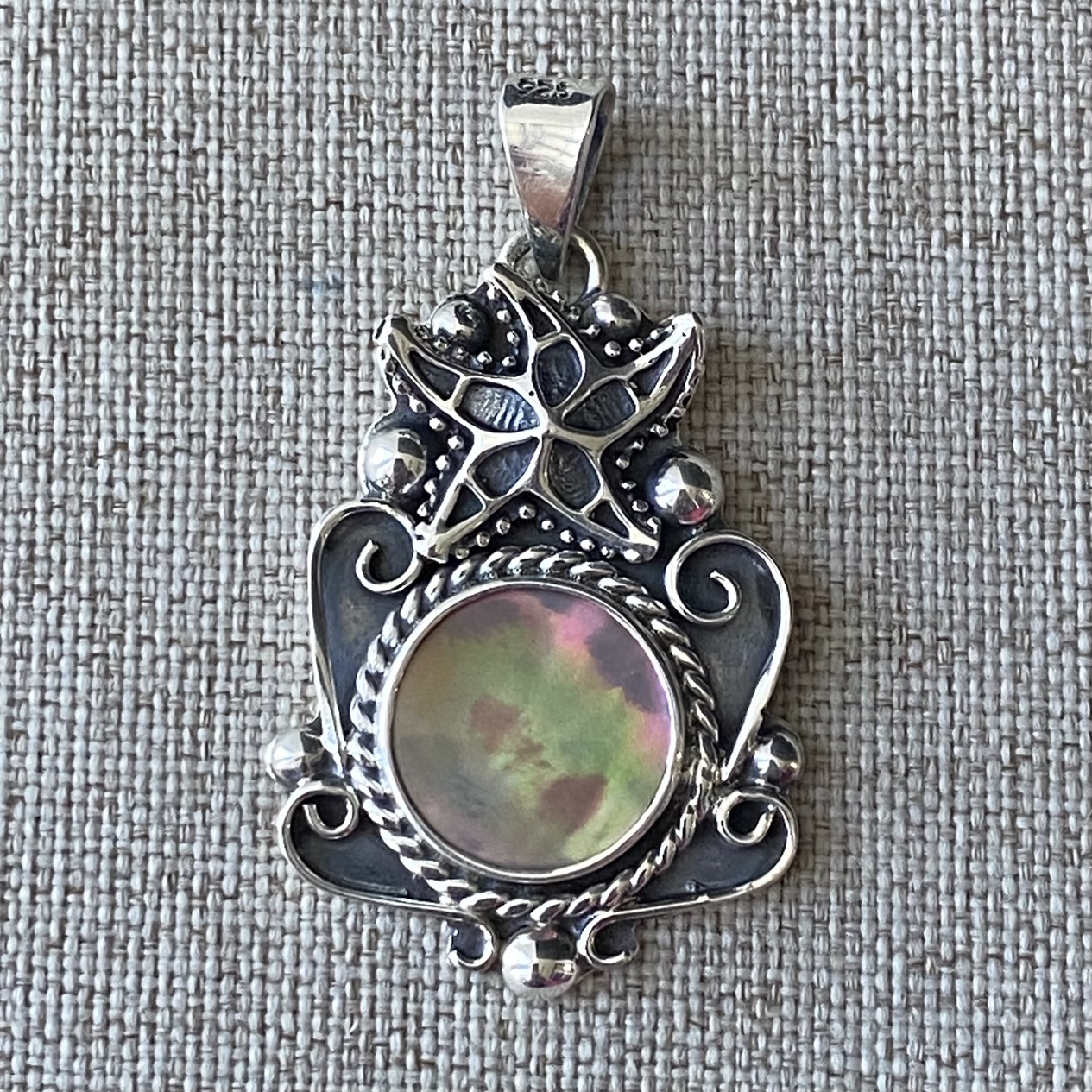 New and original pendant design with textures and lustrous finishes, crafted in 0.925 silver; its shape surrounds and enhances the piece of shell it holds, a round cut that displays beautiful and iridescent colors, hues that vary depending on how the light hits the surface.